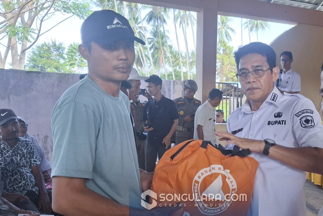 Bupati Parigi Moutong H. Erwin Burase (kanan) menyerahkan bantuan logistik kepada warga terdampak kebakaran hutan dan lahan (karhutla) di Kecamatan Parigi Utara, Rabu (18/2/2026). Foto: NR/ISTIMEWA