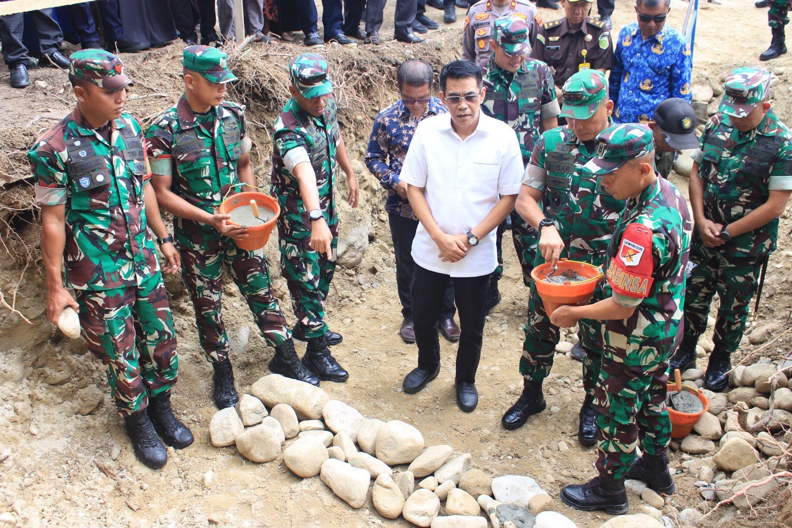 Peletakan batu pertama pembangunan Jembatan Garuda oleh Pangdam XXIII/Palaka Wira, Mayjen TNI Jonathan Binsar Parluhutan Sianipar, didampingi Bupati Parigi Moutong, Erwin Burase serta Danrem 132/Tadulako, Brigjen TNI Suntara Wisnu Budi Hidayanta. Foto: DISKOMINFO Parigi Moutong